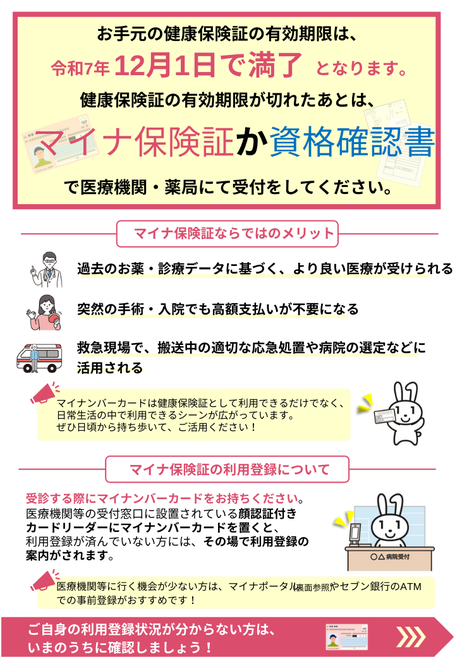 現行の健康保険証の有効期限は令和7年12月1日で満了となります。