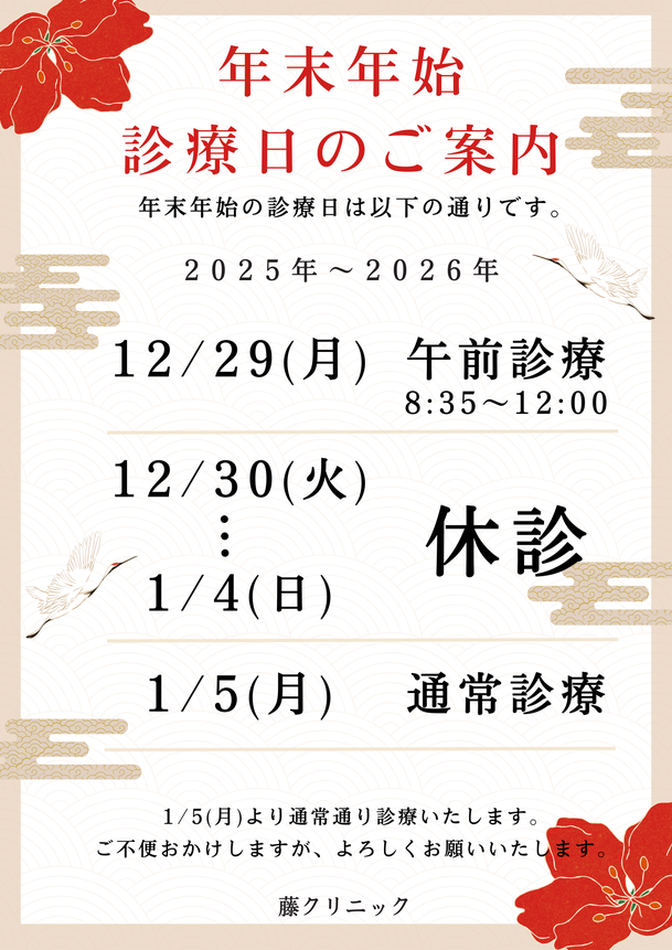 年始は1月5日(月)より通常診療となります。