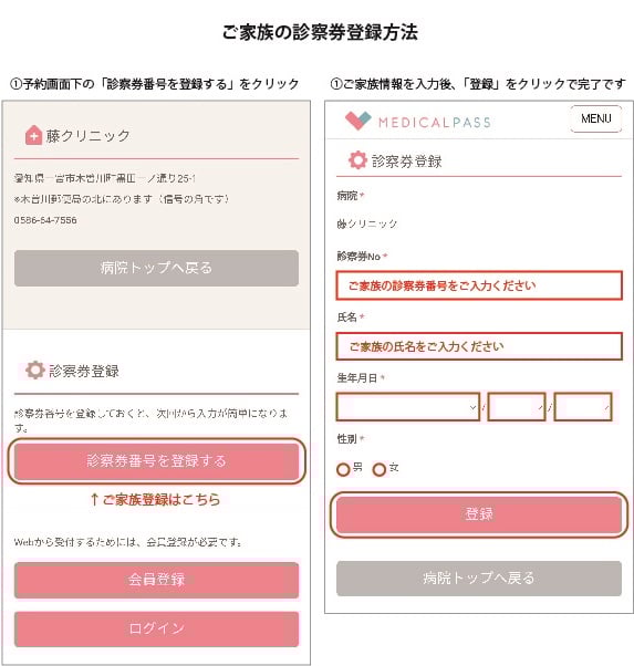 ご家族全員分のご予約をお取りする場合、ご家族分の診察券登録が必要です。
